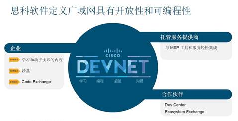 除了提供卓越的安全和應用體驗外,思科SD-WAN還具備開放性與可編程性。曹圖強表示,“首先,思科將通過 DevNet 開發(fā)平臺向所有用戶開放API,為開發(fā)人員提供更大價值;其次,對合作伙伴而言,思科希望提供一個可交互的平臺幫助用戶進行分享。任何用戶有特殊的需求,可以在DevNet 與大家分享。具體來說,在整個安全的廣域網部署中, IT人員可以通過開放的平臺,根據不同的環(huán)境和需求進行二次開發(fā)。”