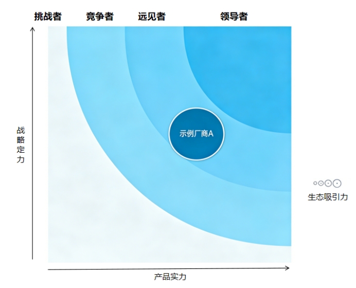 最終,我們不會簡單排出123名,而是繪制出"引力象限圖":X軸代表企業(yè)當前的產(chǎn)品實力,而Y軸則代表企業(yè)當前產(chǎn)品戰(zhàn)略,圓圈大小則代表生態(tài)吸引力。同時引力象限被劃分為四個區(qū)域——領航者、遠見者、競爭者、挑戰(zhàn)者。這種二維定位比線性排名更能反映企業(yè)的真實處境。